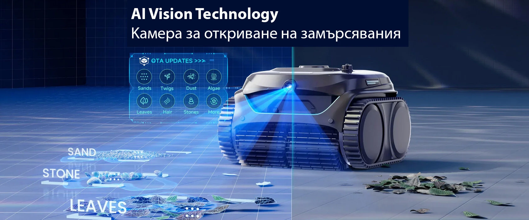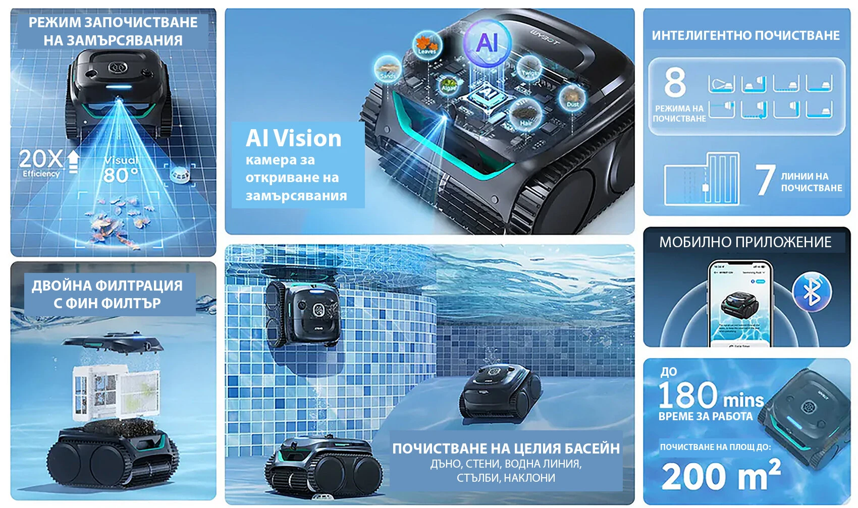 Безкабелният робот за почистване на басейни Wybot C2 Pro Vision се отличава с иновативна система за разпознаване на замърсяванията чрез използване на AI Camera Tehnology за засичане и ефективно почистване на различни замърсители. Разбира се този модел робот за басейни притежава и много други високотехнологични функции за да Ви предостави максимално удобство при поддръжката на безупречна чистота като удобно мобилно приложение чрез което можете да избирате между различни режими на почистване, двойна филтрация, която включва и ултра фин филтър, интелигентна навигация с жироскоп, камера и ултразвукови сензори, стабилна безчеткова моторна система, дълъг режим на работа.