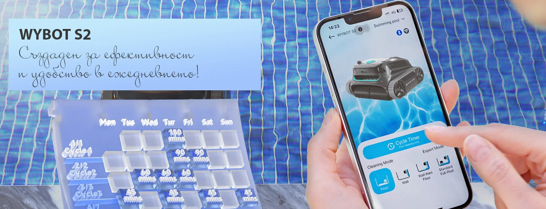 Роботът за почистване на басейни е лесен и приятен за използване като Ви дава възможност да избирате между различни режими, опции и настройки за график в мобилното приложение. Wybot S2 притежава акумулаторна батерия, която осигурява до 210 минути непрекъсната работа и покритие на до 300 кв. м площ!