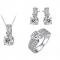 18-каратно бяло позлатено покритие.Материал: месинг Изработено с кристали от Swarovski® Комплектът включва един чифт обеци, пръстен и колие Размери на пръстените с вътрешен диаметър: 16 мм. Размер мерижка на колието - 48см. Цвят - сребрист Инструкция за поддръжка – Важно - Бижутата са с декоративна цел. За разлика от изработените от масивно злато или други благородни метали, запазването им в добро състояние по дълго време изисква грижа. Не упражнявайте труд с бижута по вас – лек, тежък, домакинска работа и т.н. Това може да доведе до деформации или нарушаване на целостта на изделието. Пазете бижутата с кристали и камъни от вода – при монтажа на някои от тях се използват лепила, които не издържат на продължително мокрене (най-вече с топла вода) и може да предизвика отлепване. Не носете бижутата едно до друго или едно върху друго, за да предотвратите надраскване и износване на метала. Пазете бижутата от прекомерни нагрявания или удари в твърди повърхности с тях. Избягвайте контакт с морска или минерална вода, химикали, домакински препарати, парфюм и лосиони. Козметичните продукти съдържат алкохол и киселини, които оказват пагубно влияние на бижуто. Слагайте бижутата няколко минути след поставяне на кремове и лосиони, както и след гримиране. Сваляйте бижутата преди лягане, миене, къпане. За пръстените и обеците с перли или изпъкнали елементи препоръчвамe, когато сваляте бижуто, да не го дърпате за изпъкналата част. В случай, че има заяждане на елементи, внимателно раздвижете елементите до тяхното отпускане. Независимо от това, продължителността на носене и начина на третиране на бижуто, може да доведе до поява на признаци на износване и промяна на цвета на метала.
