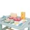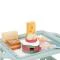 Детски дървен поднос с принадлежности. В комплекта са включени дървен поднос на стойка, меню, вилица и нож, и всичко необходимо за една богата закуска. Играчката е изработена от висококачествени дървени материали и нетоксични бои.