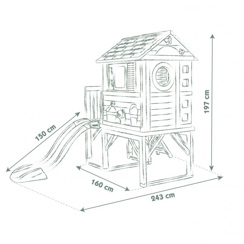 Къщата на кокили Smoby Life е идеална за забавление с приятели и за развиване на вашето въображение! Като истински авантюристи, вашите деца могат да стигнат до колибата си по стълбата. Разположена на платформа с височина 70 см, къщата предлага безпрепятствена гледка към градината. Благодарение на оградата и 3-те прозореца на различните фасади, вашите малки авантюристи могат да следят всичко! Докато един ще се забавлява, спускайки се по пързалката, друг може да създаде хиляда и една истории на верандата на хижата! Вашите малки могат също да играят игра на криеница благодарение на 2-та плъзгащи се люка, които им помагат да спечелят играта! За още по-забавно можете да добавите електронен звънец (не е включен): вашите деца могат да бъдат предупредени за пристигането на малките си приятели! Тази хижа бързо ще се превърне в любимото им място за забавление през целия ден! Къщата не само е изработена от здрави материали, но е и анти-UV обработена, за да се осигури здравина и издръжливост на цветовете във времето. Тази играчка съдържа рециклиран материал. От 2 години. Произведено във Франция.
