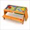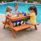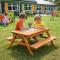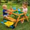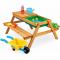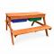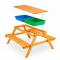 Детската дървена маса с пейки и пясъчник GINGER HOME е практично и многофункционално решение за игра, творчество и забавление на открито. Този 2в1 детски продукт, в обновен модел с подобрена функционалност и дизайн, комбинира детска маса с две пейки и вграден пясъчник, което го прави идеален избор за двор, градина, тераса или външна зона за игра. Благодарение на повдигащия се плот, детската маса лесно се трансформира в пясъчник. Под плота са разположени две подвижни пластмасови кутии, подходящи за пясък, вода, играчки и аксесоари. Когато плотът е затворен, продуктът функционира като стандартна детска дървена маса с пейки, подходяща за хранене, рисуване, писане и настолни игри. Изработена от масивна дървесина (ела) и здрави метални елементи, детската дървена маса с пясъчник е стабилна, устойчива и предназначена за дълготрайна употреба на открито. Конструкцията е EN71 тествана, което гарантира безопасност при ежедневната игра на децата. С компактните си размери 90 x 86 x 50 см, детската маса с пейки и пясъчник GINGER HOME е подходяща за различни външни пространства. Теглото от 9 кг осигурява отлична стабилност, като същевременно позволява лесно преместване при необходимост. Този детски комплект за игра на открито подпомага креативността, фината моторика и активната игра, като създава безопасна и забавна среда за децата.