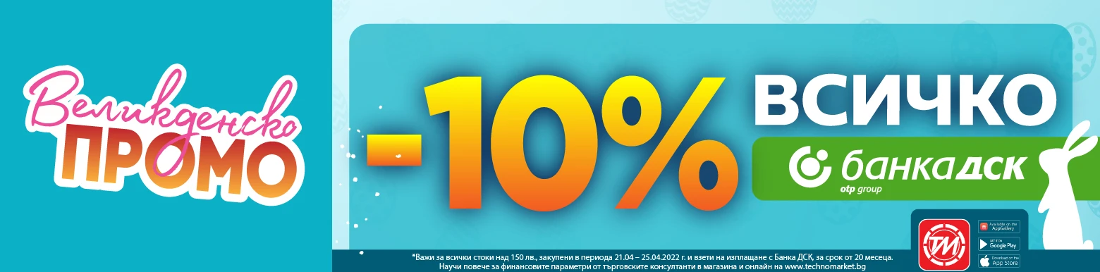 Промоцията важи за всички стоки във верига магазини Техномаркет и онлайн, в сайта на търговеца, при минимална стойност на покупката 150 лв. /след прилагането на отстъпката от 10% от цената на избрания продукт/.