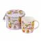 Весел детски комплект от цветна чаша от порцелан с надпис „ Happy Birthday “ и касичка с катинарче със сладка украса на мъфини и сладкиши с черешка. Зарадвайте детето си с настроение за целия ден и го предизвикайте да използва касичката по предназначение. Размери : Ø 8,5 см. ; височина на чашата 9 см. ; вместимост 350 мл. Размер на касичка: Ø 13 см. ; височина на касичка: 10 см.