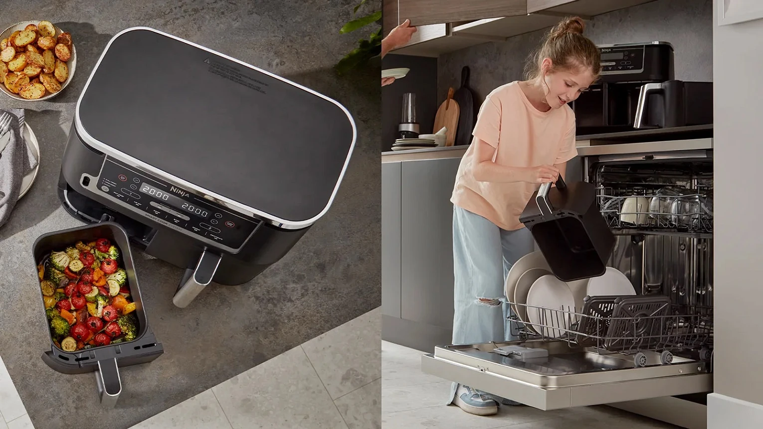 С функцията SYNC можете да готвите две различни храни, като използвате различни времена, температури и програми - и двете са готови за сервиране едновременно! Искате ли да печете във фурната в едното чекмедже и да пържите на въздух в другото? Няма проблем! Различни времена за готвене на печено пиле и хрупкави пържени картофи? И двете зони завършват готвенето едновременно, така че можете да се насладите на прясно приготвени основни ястия и гарнитури заедно - няма нужда да използвате различни уреди или да оставяте гарнитурата да изстине, докато основното ястие приключи готвенето! Независимо дали става дума за хрупкаво пиле и пухкави пържени картофи, риба и пържени картофи или печена сьомга и средиземноморски зеленчуци, перфектната комбинация е само на няколко минути. Готвене за две различни диетични изисквания? Разпространете думата, като готвите вегетарианска храна в едното чекмедже и месо в другото.