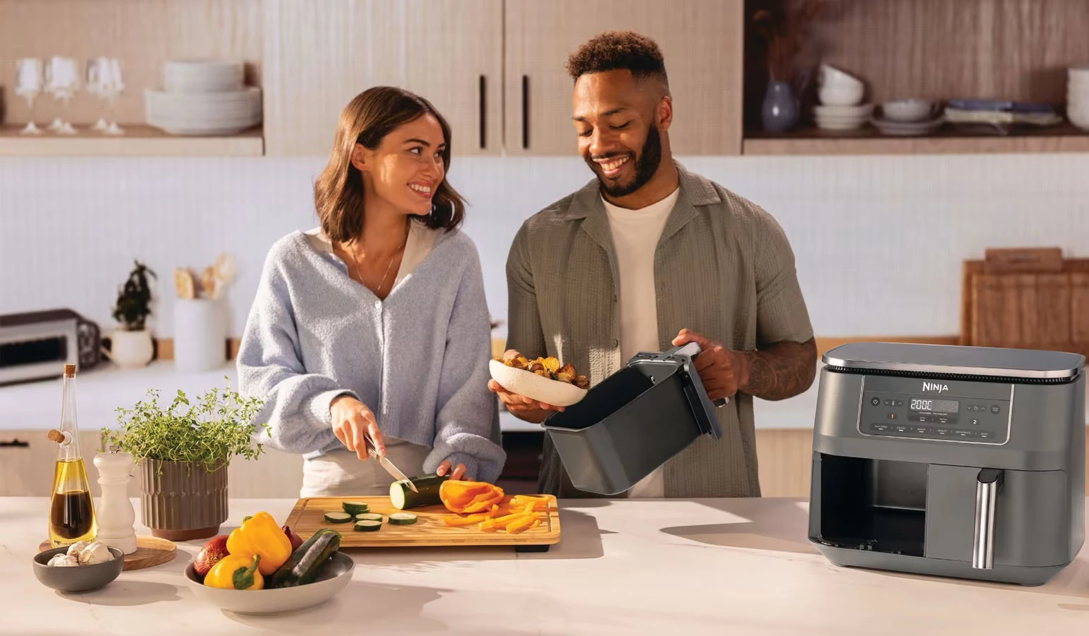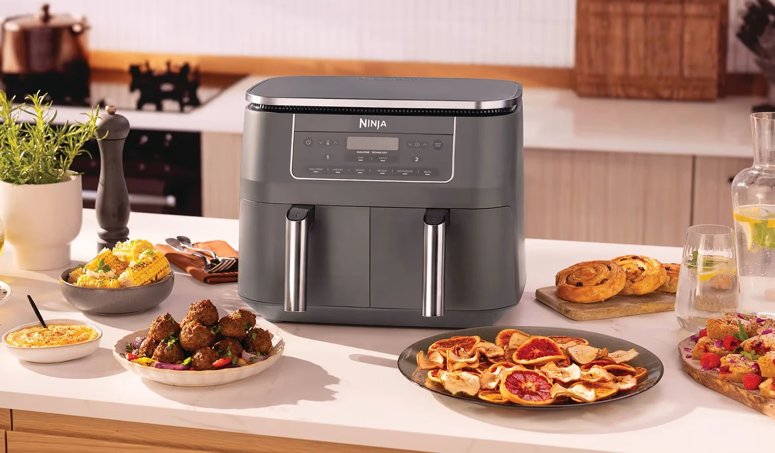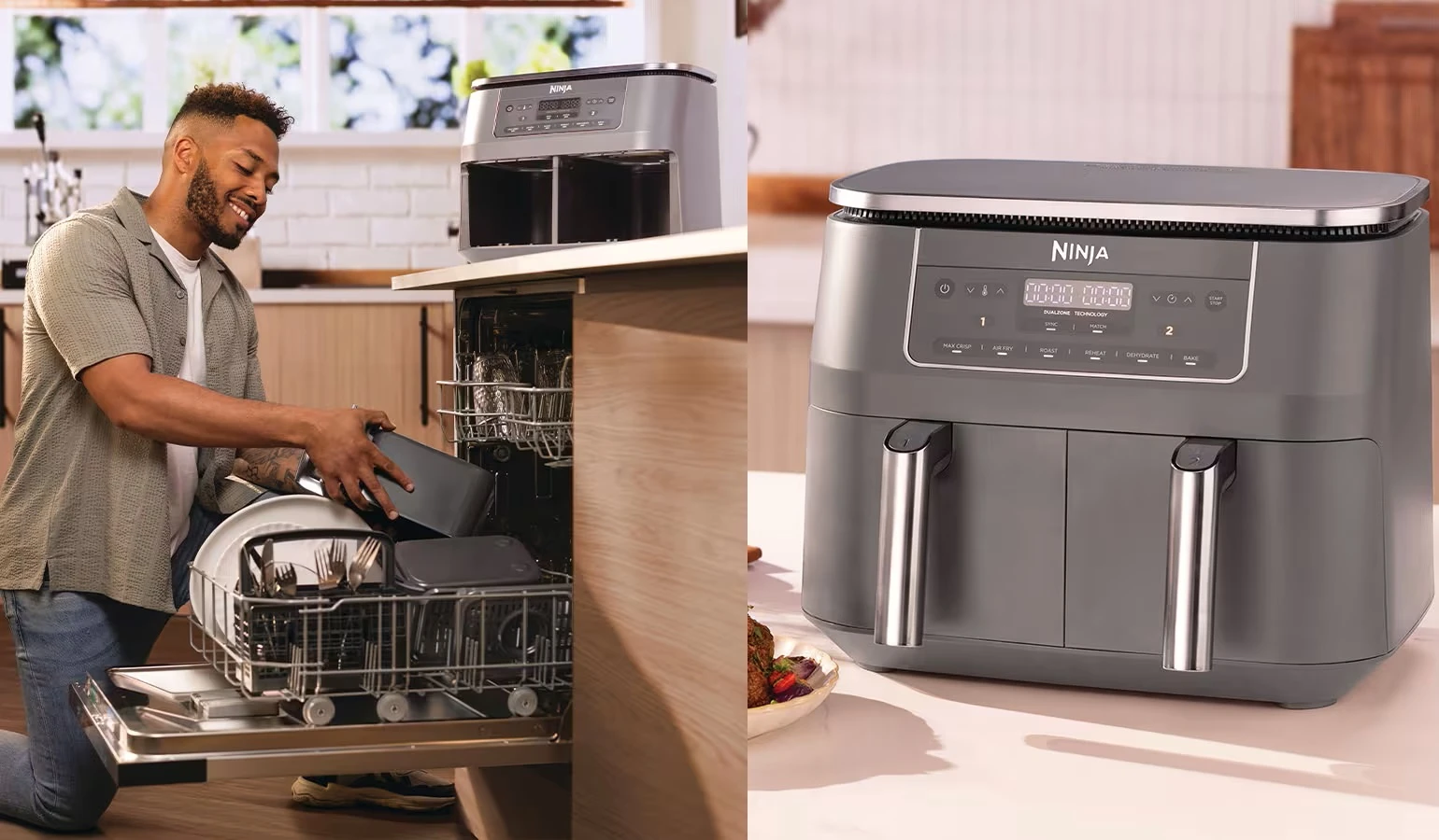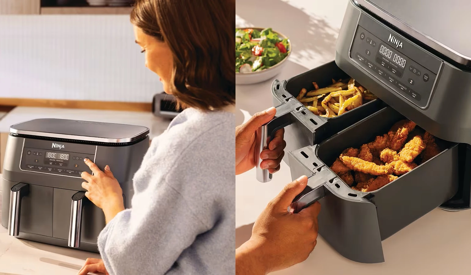 Запознайте се с фритюрника с горещ въздух, който готви две ястия, по два различни начина и е готов едновременно – сега с преработен външен вид и елегантни, тъмносиви метални акценти.