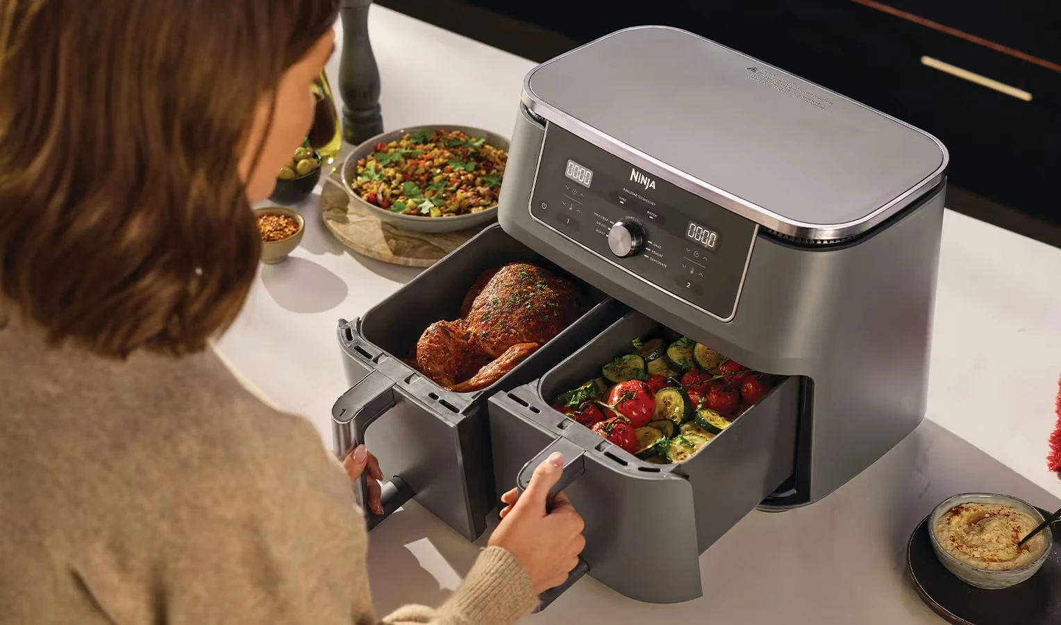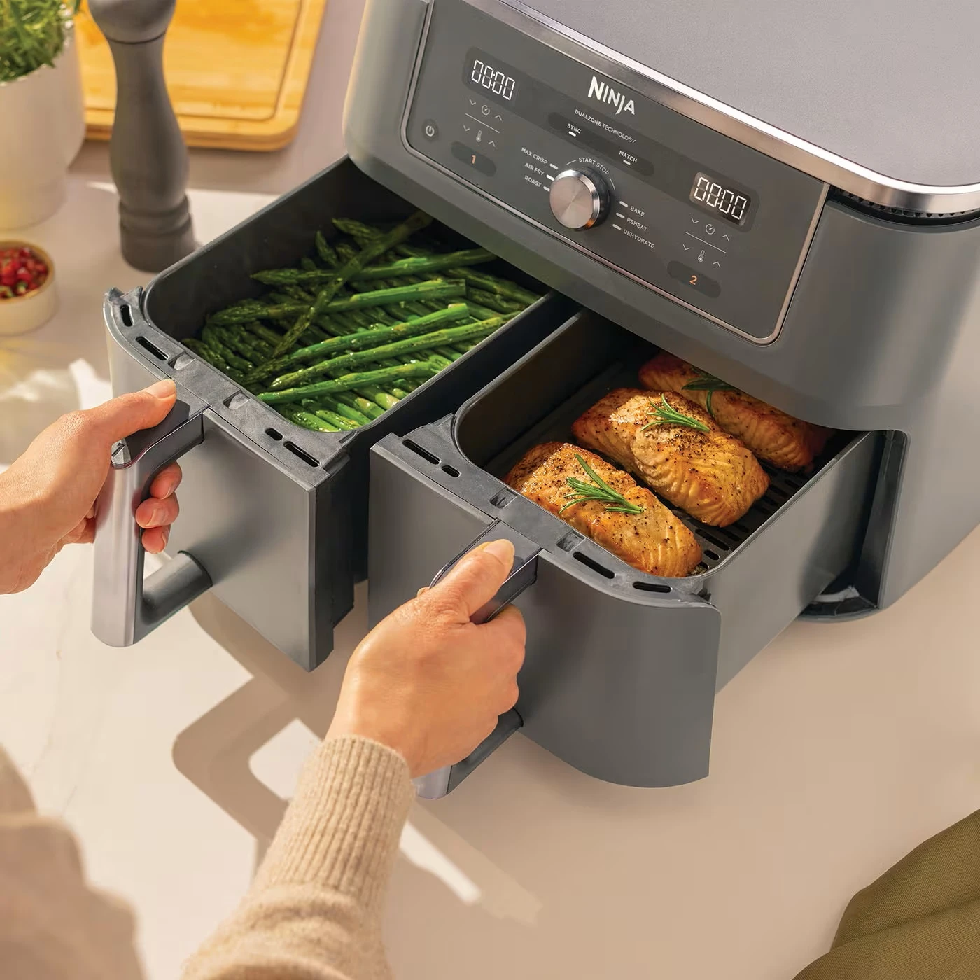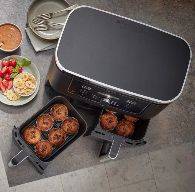 Различни храни, различно време за готвене, различни програми – всички готови за сервиране едновременно! С двете отделни кошници можете да настроите програмите и времената за готвене, използвайки SYNC или MATCH – за гъвкаво и удобно готвене. Капацитетът от 9,5 л е достатъчен за 6–8 души. Във всяка кошница се побира пиле от 2 кг.