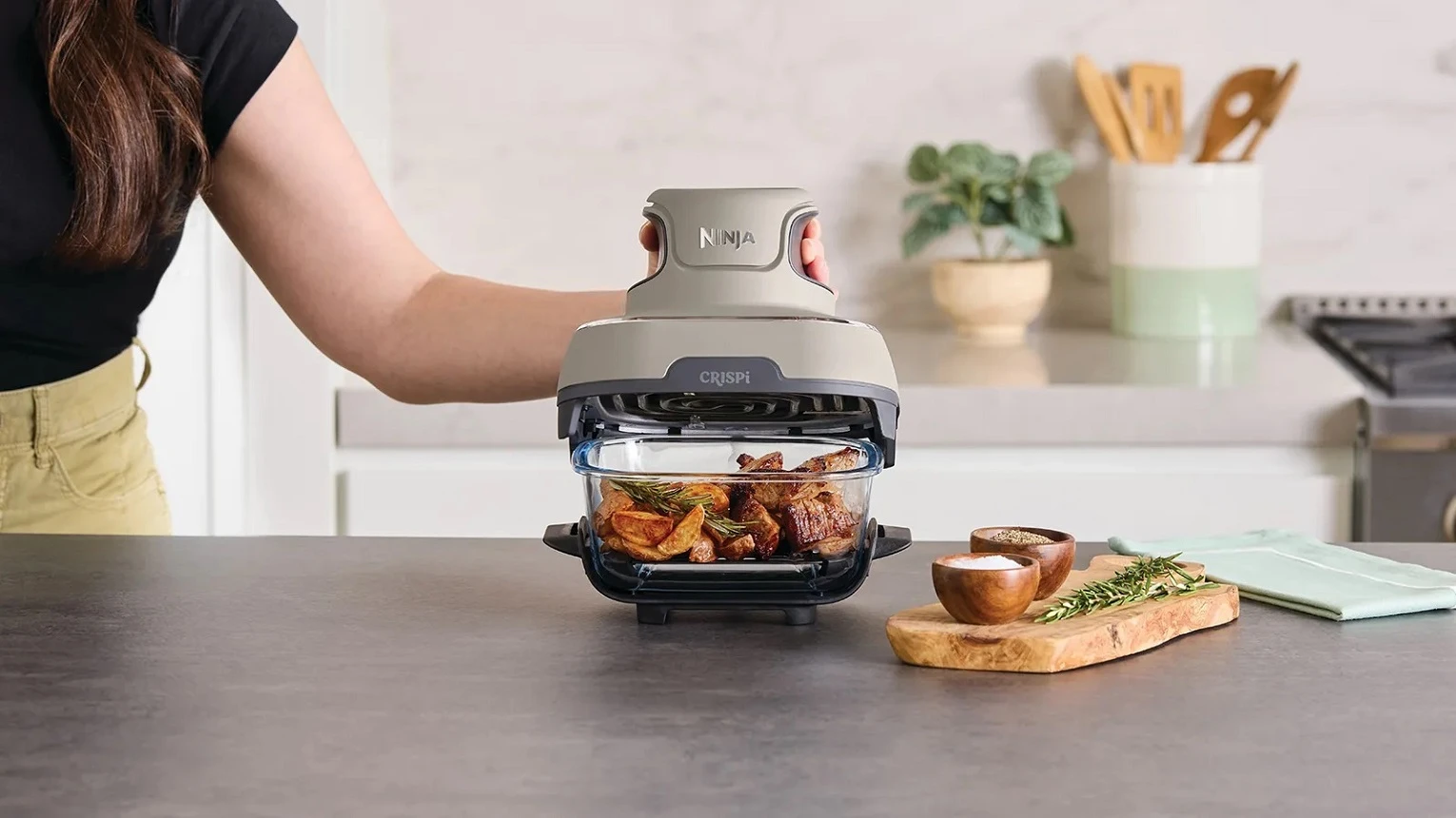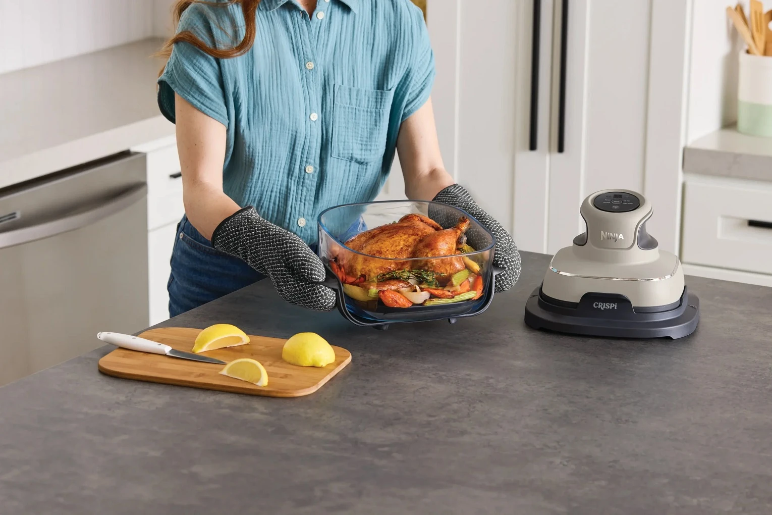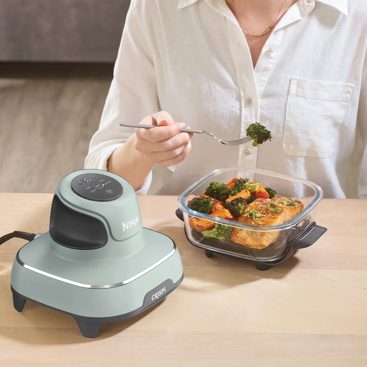 Една система – много възможности. Четири програми: Air Fry (пържене с горещ въздух), Roast (печене), Keep Warm (поддържане на топлина) и ReCrisp (освежаване на храна). Горещият въздух до 185°C готви равномерно и прави храната приятно хрупкава, а незалепващите Crisper плочи осигуряват циркулация на въздуха от всички страни. Идеално за затопляне на остатъци и намаляване на хранителните отпадъци.