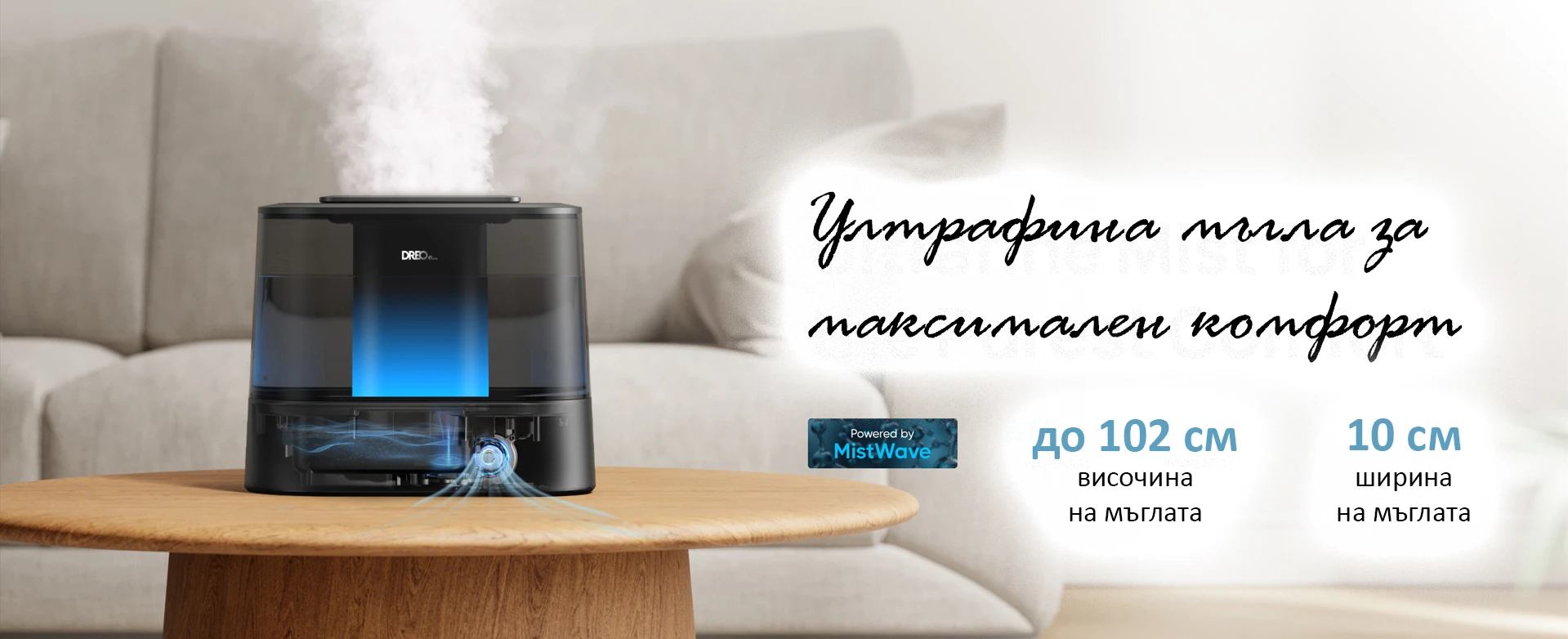 Овлажнителят DREO 420S осигурява бързо овлажняване със скорост на изпарение до 300 мл/ч. Благодарение на иновативната технология за овлажняване MistWave, този овлажнител създава мъгла с височина до 102 см с фини частици с размер от 5 µm, които разпределят влажността равномерно в стаята. Резервоарът му от 4 литра осигурява дълготрайно овлажняване в продължение на до 30 часа.