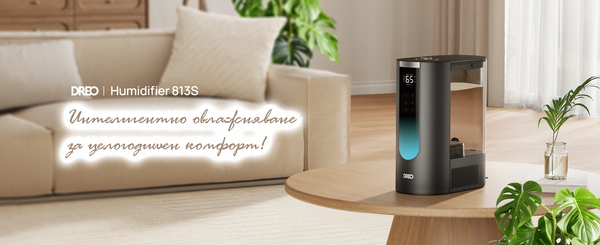 Овлажнителят DREO 813S осигурява супер бързо овлажняване със скорост на изпарение до 500 мл/ч. Той разполага и с опция за бърза топла мъгла (56°C само за 5 минути) за незабавно облекчаване на сухата среда в помещението. Благодарение на иновативната технология за овлажняване MistWave, този овлажнител с топла и студена струя създава мъгла с височина до 102 см с фини частици с размер от 5 µm, които разпределят влажността равномерно в стаята. Резервоарът му от 6 литра осигурява дълготрайно овлажняване в продължение на до 45 часа.