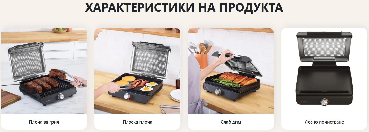 Перфорираният мрежест капак се сваля за лесно почистване в съдомиялна машина или на ръка. Подвижните плочи за готвене са с незалепващо покритие за лесно почистване. Уловителят за мазнина задържа изтичането на мазнина или соковете от готвенето, за да не предизвиква бъркотия при готвене и да се почиства лесно. Поддържайте ред с удобното място за съхранение на кабелите на борда.