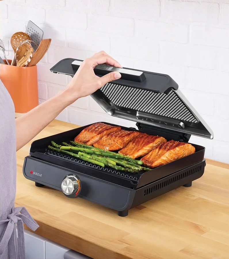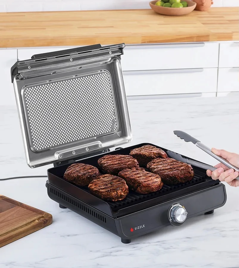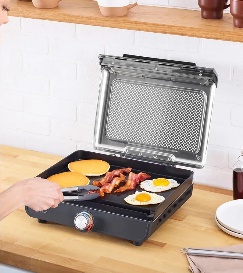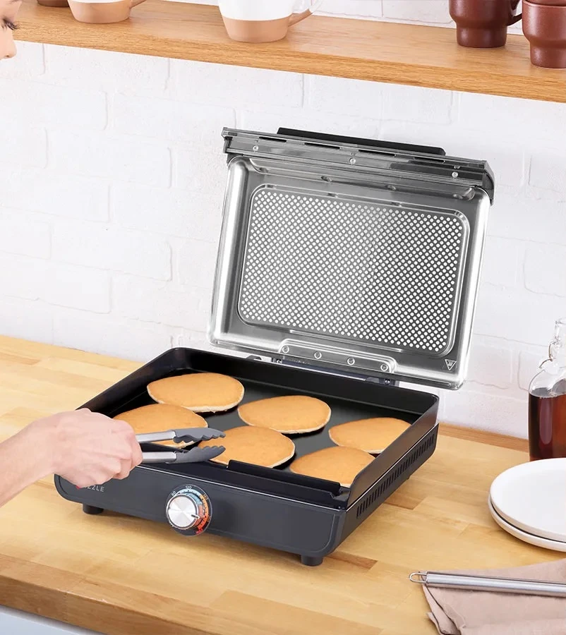 С вдигнат капак храната се нагрява с концентрирана топлина за автентичен вкус на скара и перфектно запържване - чудесно за приготвяне на деликатни храни или постни протеини като риба и зеленчуци на скара, без да се преваряват, или на храни, които изискват обръщане, като яйца, палачинки и пържени ястия. Спуснете капака, за да запазите топлината и да разтопите гарнитурите - идеално за бълбукащо сирене на скара или зареден начос, за приготвяне на дебели парчета пържола или замразени скариди. Перфорираният мрежест капак също помага за предотвратяване на пръски и може да се отстранява за лесно почистване, за да се избегне натрупването на мазнина.
