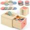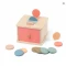Комплектът включва стабилна дървена кутия с чекмедже и множество цветни дискове. Играта е едновременно проста и завладяваща: детето трябва да намери правилния процеп за всеки диск, развивайки търпение, концентрация и прецизност.