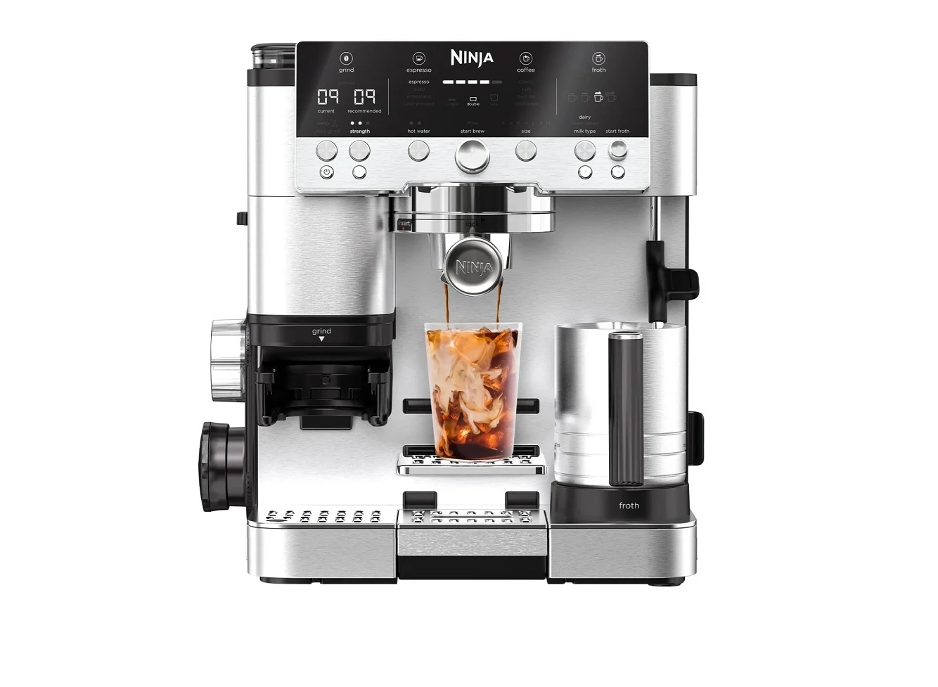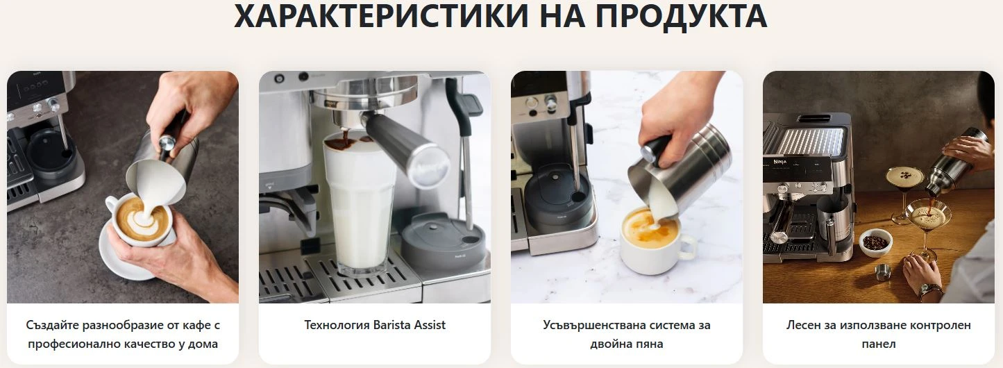 Универсалната кафе машина Ninja ви помага да приготвите впечатляващо разнообразие от перфектно балансирани топли и студени напитки, съобразени с вашите предпочитания. Изследвайте гъвкави автоматични и ръчни режими, за да настроите перфектното си кафе: 4 стила еспресо: единично, двойно, американо и студено пресовано 4 стила кафе: класическо, наситено, с лед и студено кафе 7 размера чаши: 175 мл, 235 мл, 295 мл, 355 мл, 415 мл, 475 мл и 530 мл 4 настройки за пяна: затоплено мляко, тънка пяна, гъста пяна и студена пяна 25 настройки за смилане: ръчна настройка на дължината на кафето Лесен за употреба контролен панел