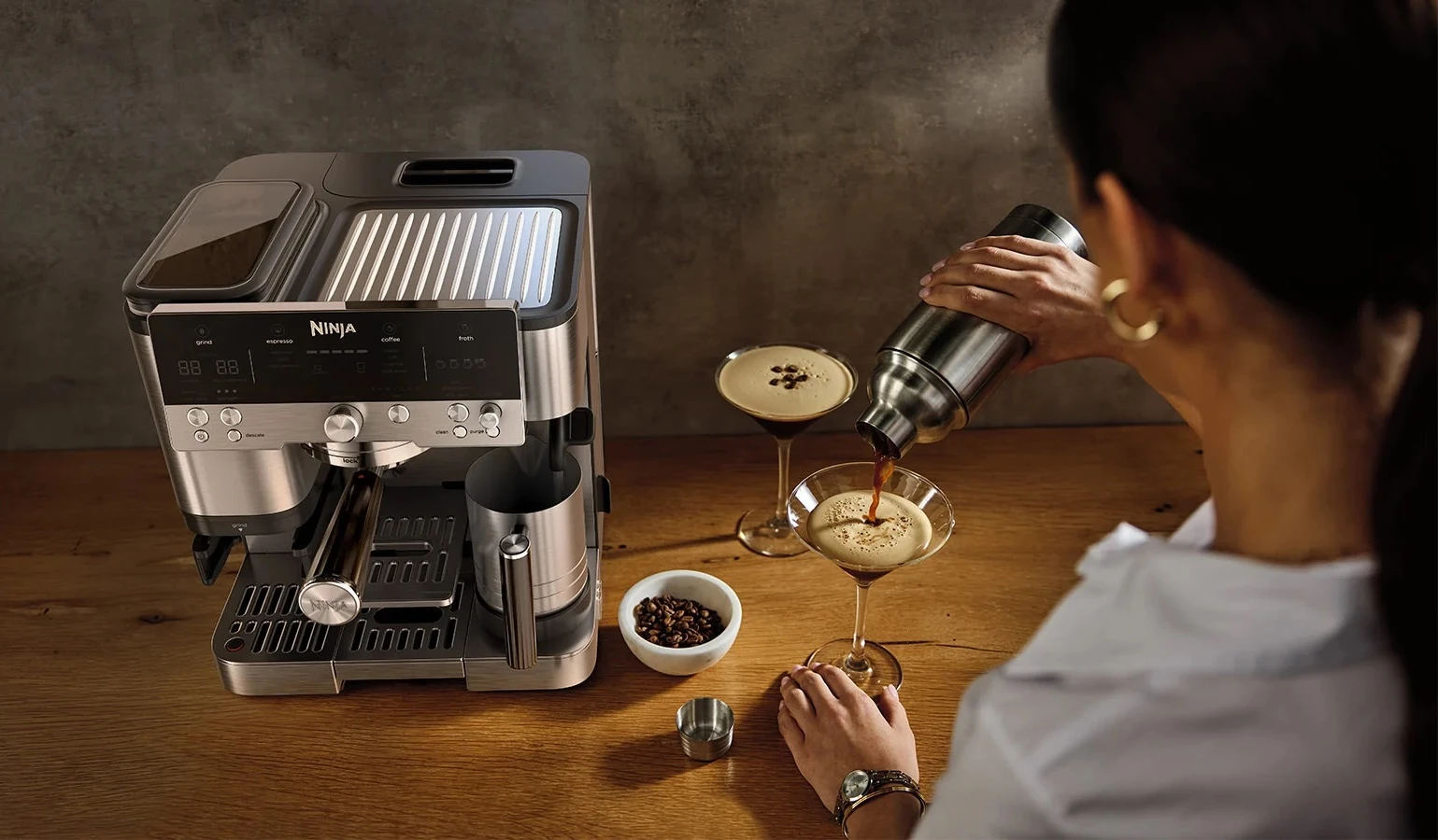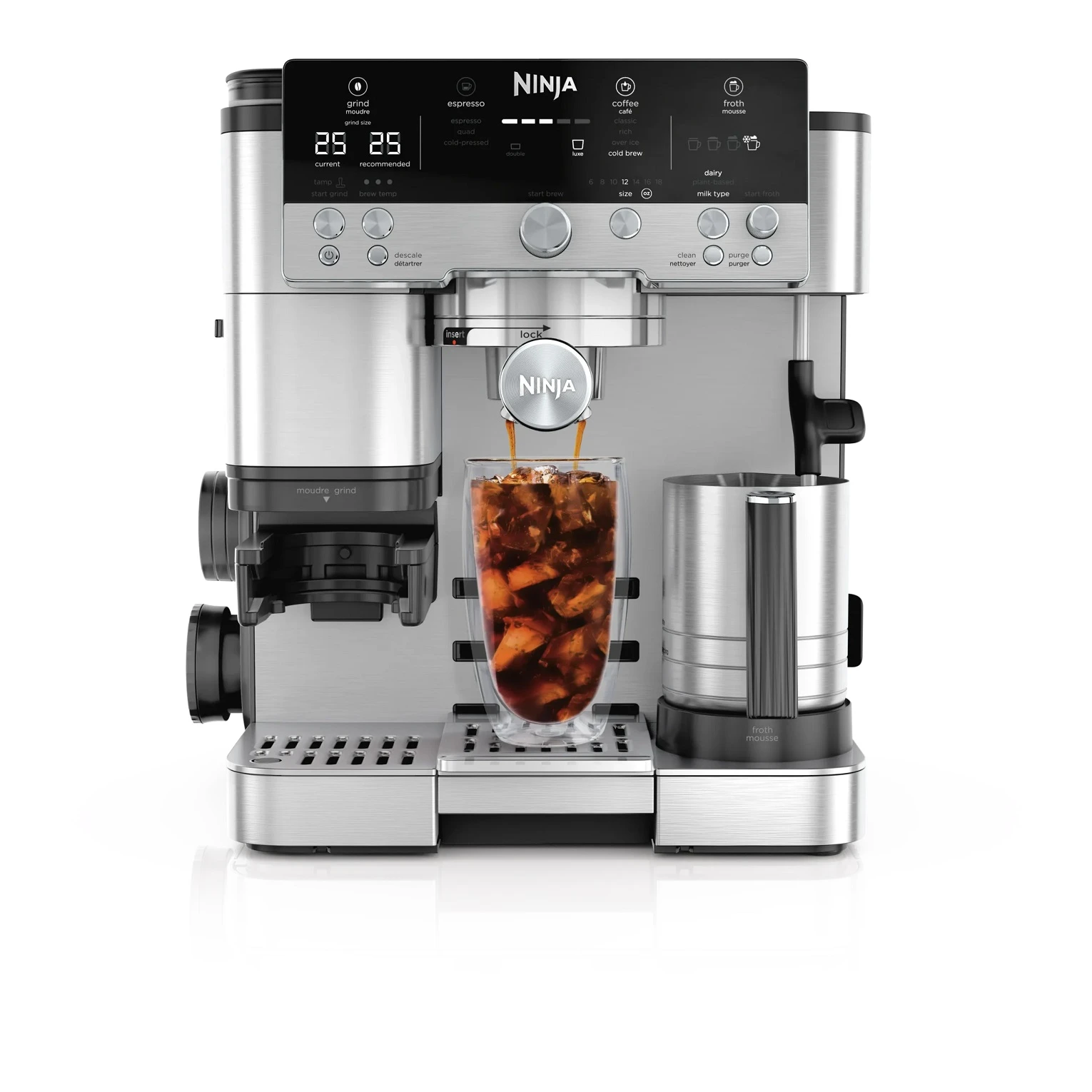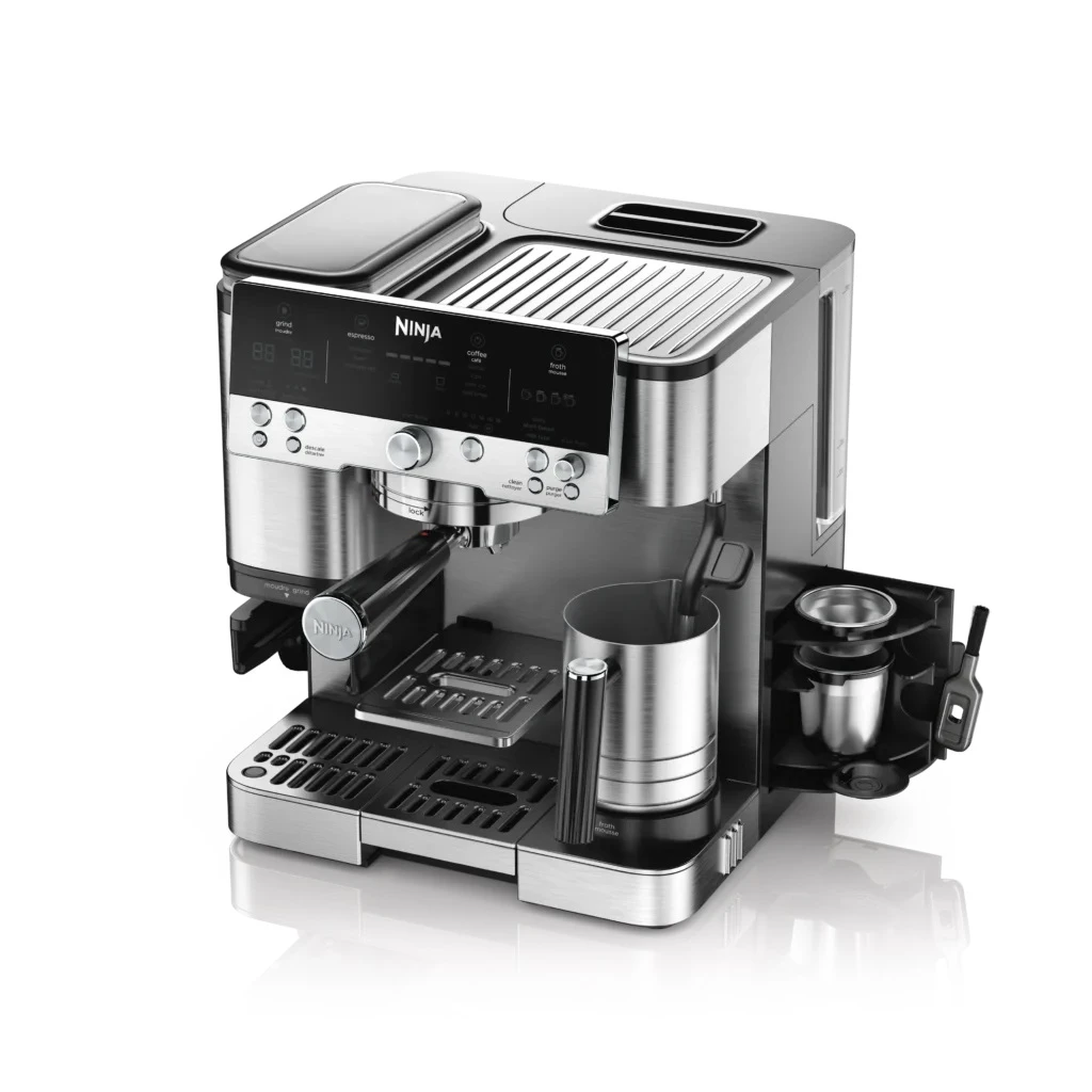 Насладете се на професионалното качество на кафето с многофункционалната 3-в-1 еспресо машина. Кафе машина за бързо приготвяне на стандартно или студено кафе и филтър на Ninja. От ръчно смилане до автоматични настройки за пяна, създавайте напитки по ваш вкус. С вградена кафемелачка, плюс удобен тампер, това е истинско чудо от зърната до чаша.