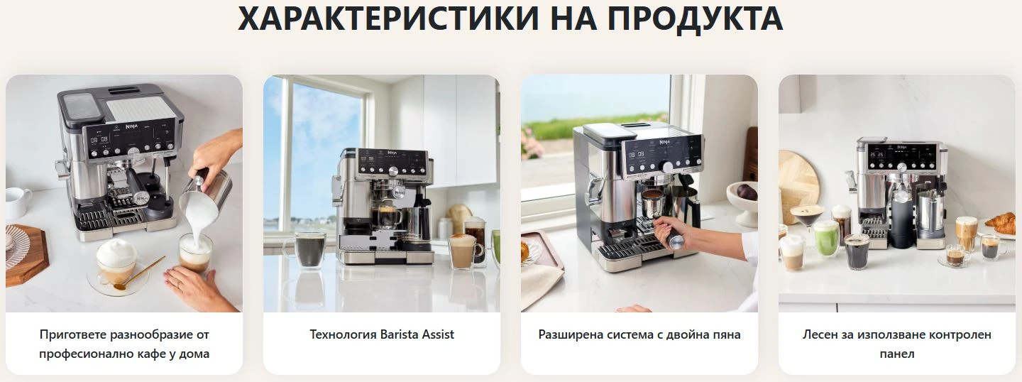 | Функции | Еспресо, Лате, Американо, Филтърно Кафе, Студено Кафе (Cold Brew) |
