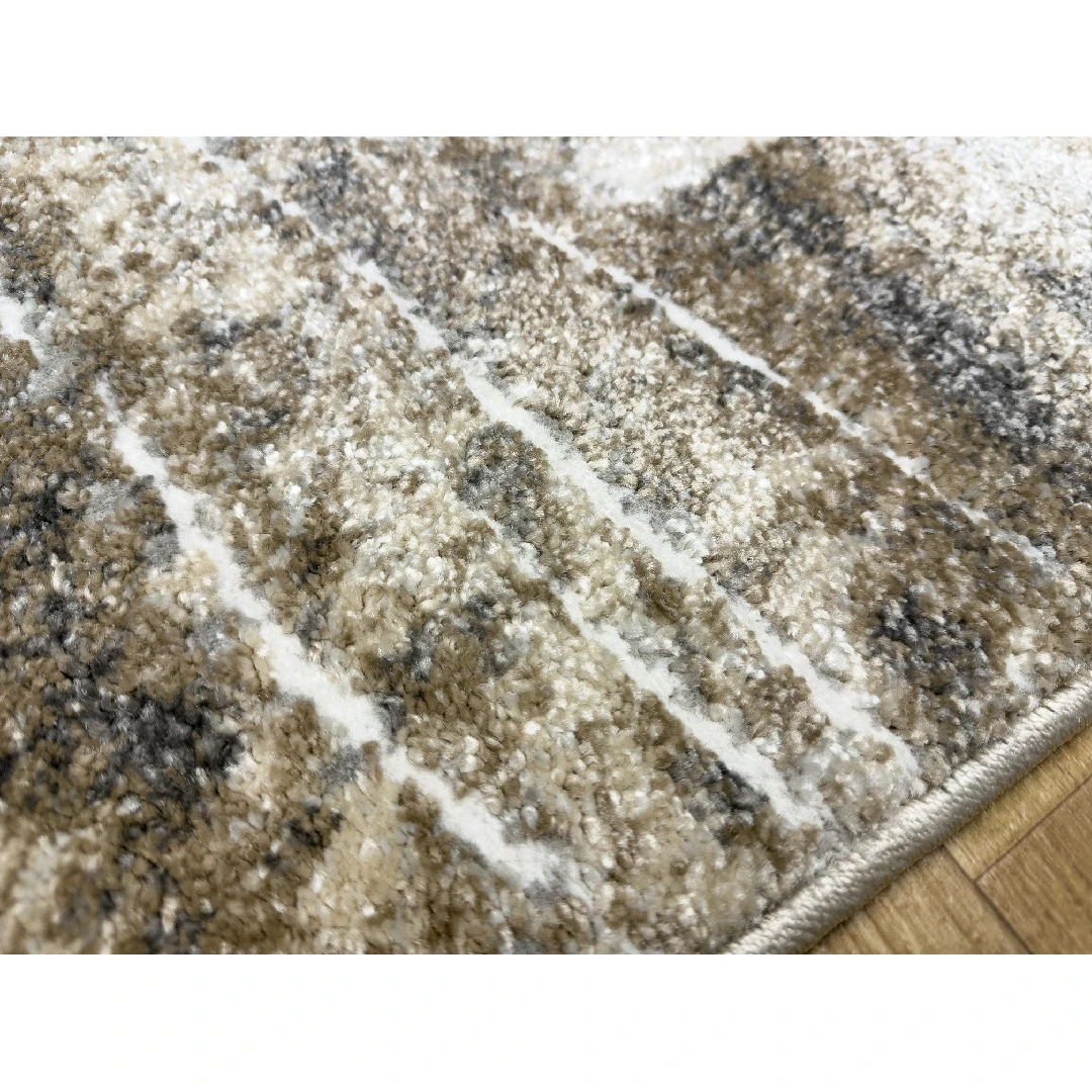 Кафяв/Бежов/Сив Лагос 368 е част от модерната колекция килими, която съчетава абстрактен артистичен дизайн с натурални земни тонове. Декорацията включва динамични линии и щрихи, наподобяващи четкови удари, които създават усещане за движение и текстура. Цветовата гама от кафяво, бежово, сиво и бяло придава топлина и универсалност, като го прави подходящ за различни интериорни стилове – от модерен до бохо и индустриален.
