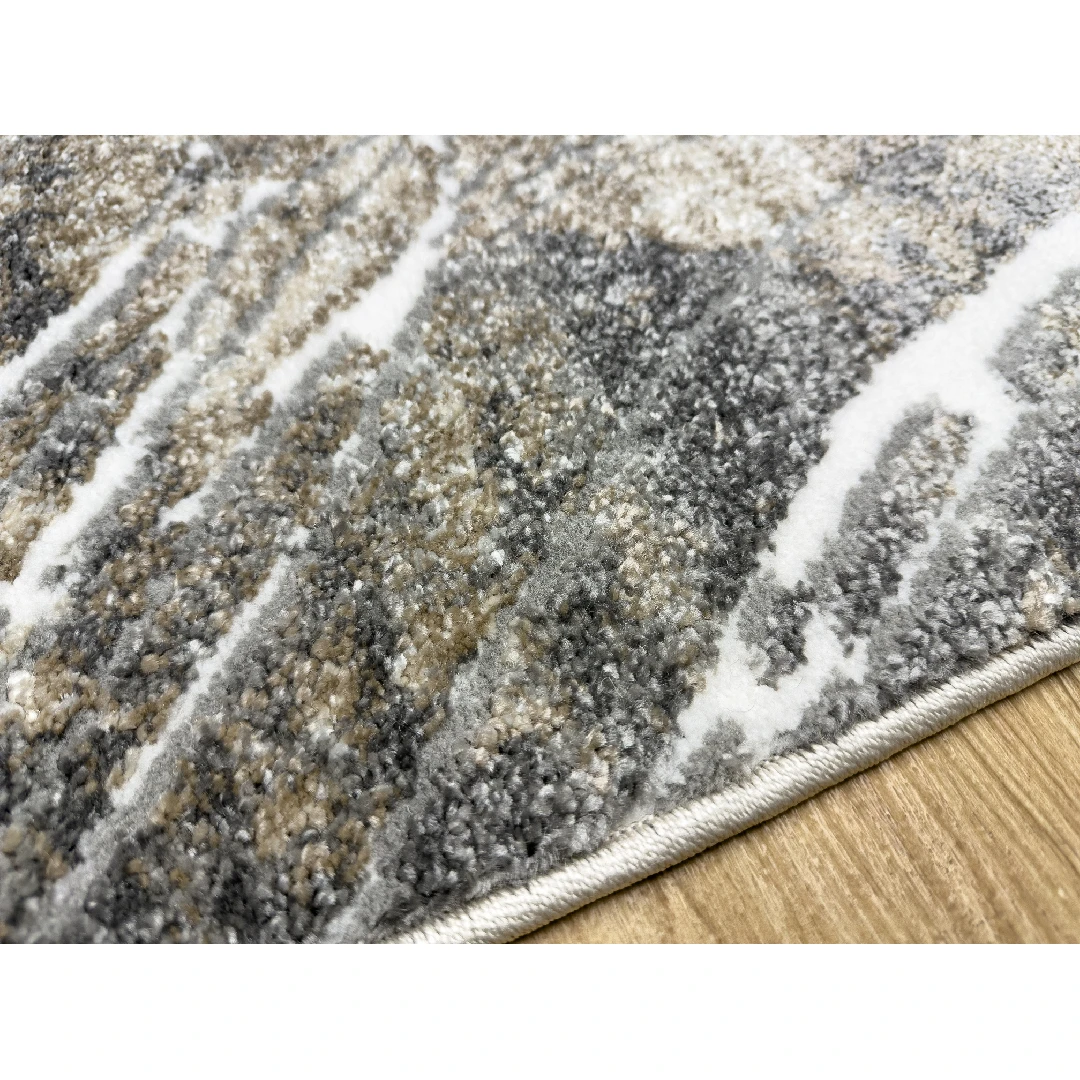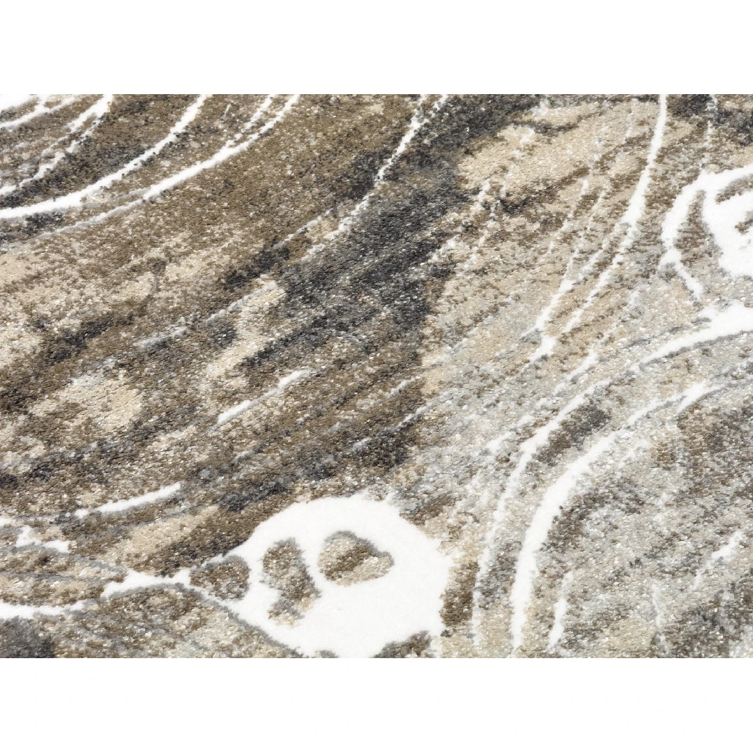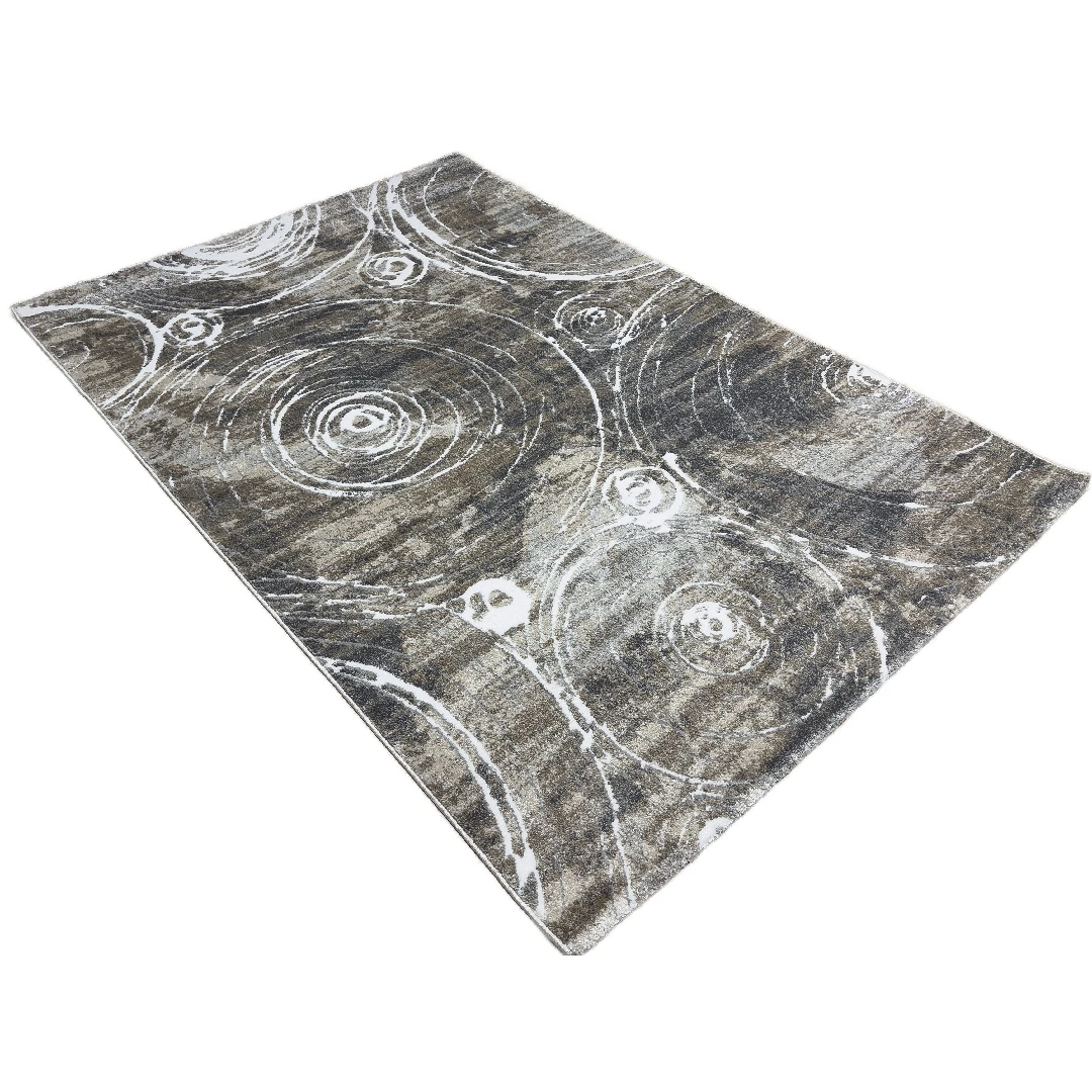 Кафяв/Сив/Бежов Лагос 370 е част от модерната колекция килими, която съчетава абстрактен дизайн с артистичен характер. Декорацията включва кръгови концентрични мотиви и динамични линии, разположени върху фон в земни тонове. Цветовата гама от кафяво, сиво, бежово и бяло създава усещане за баланс и дълбочина, като придава на помещението едновременно уют и модерна визия.