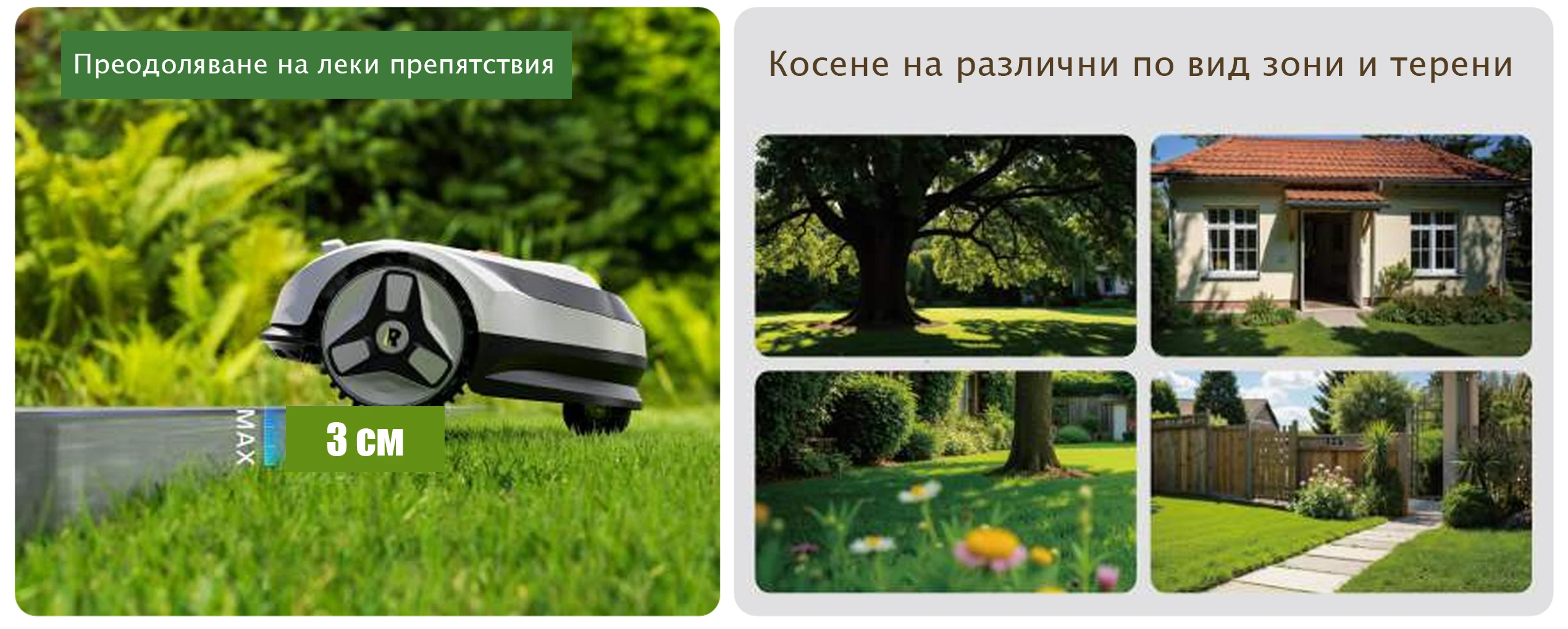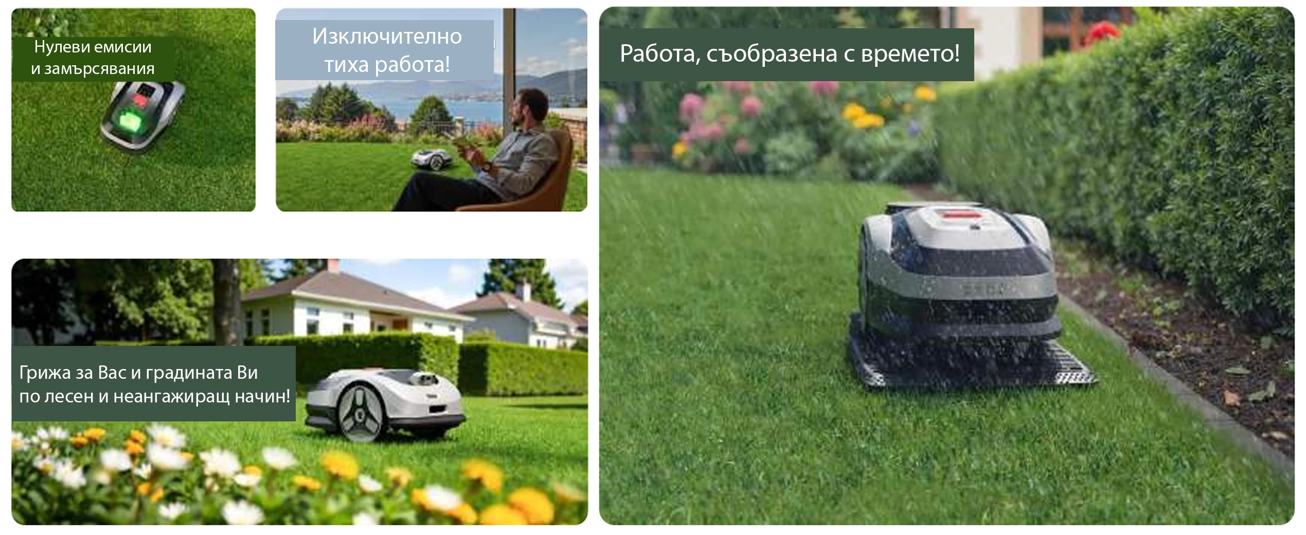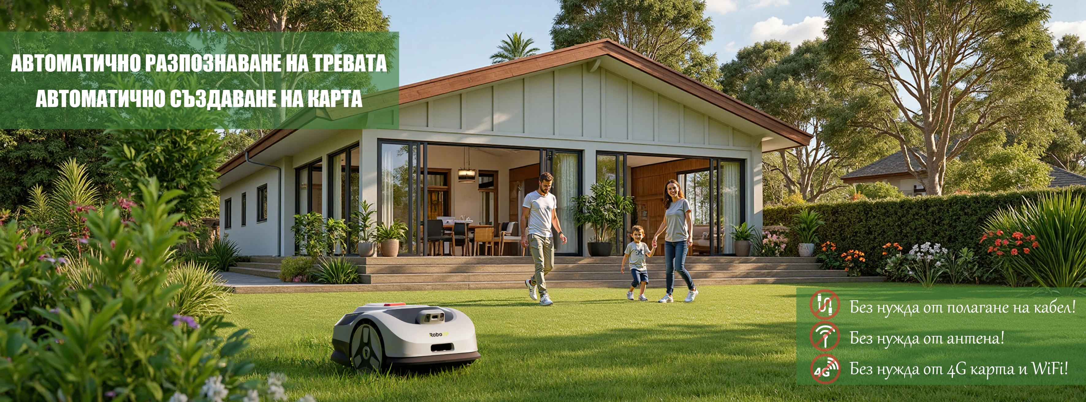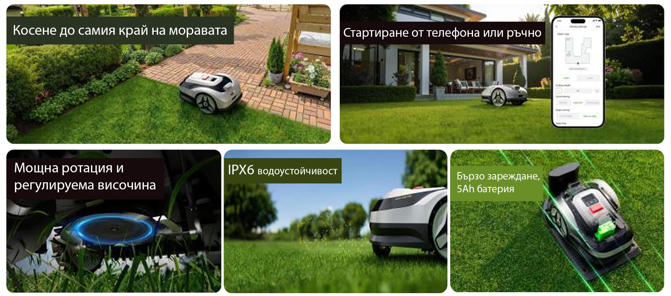 Автоматично разпознаване на тревата, косене покрай лехи и пътеки без нужда от ограничителен кабел, лесен монтаж без нужда от инсталиране на антена или поддръжка на 4G карта, бързо зареждане, възможност за стартиране на косене чрез мобилно приложение или чрез натискане на бутона върху корпуса на косачката!