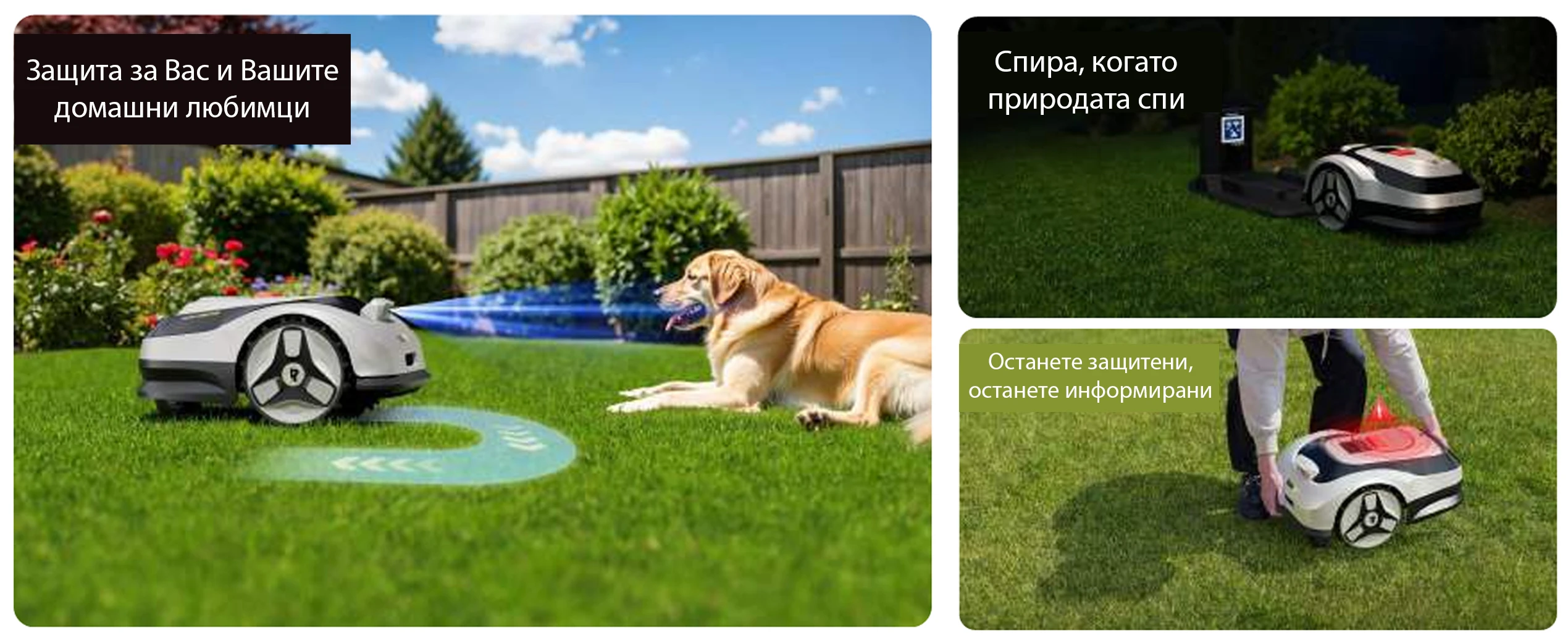 С визуална навигация и AI Camera за прецизно избягване на препятствия, безопасност за животни и интелигентни предупреждения за безопасност, тази косачка осигурява безгрижно изживяване за всички!