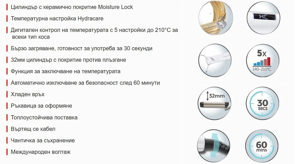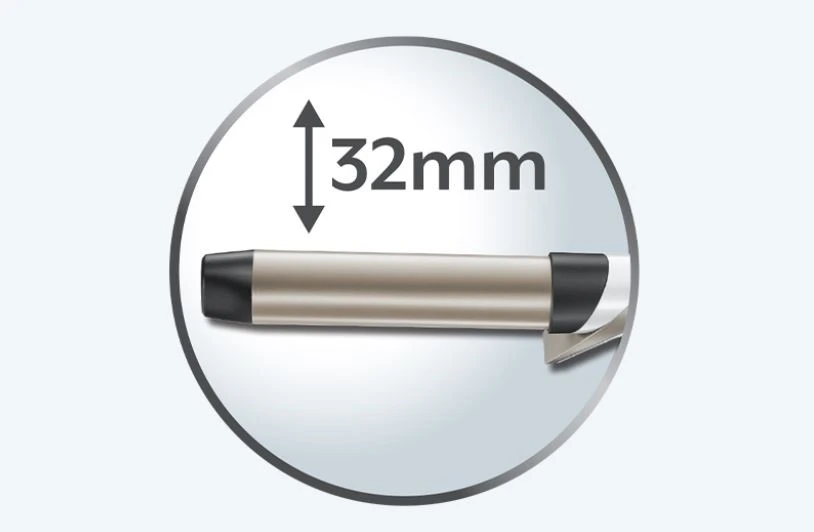 32мм цилиндър на машата за къдрене Hydraluxe е идеалният размер за постигане на свободни къдрици и модерните плажни вълни. Покритието против плъзгане дава възможност да се фокусирате върху правенето на прическата без да се притестявате, че косата ще се хлъзга от цилиндъра.