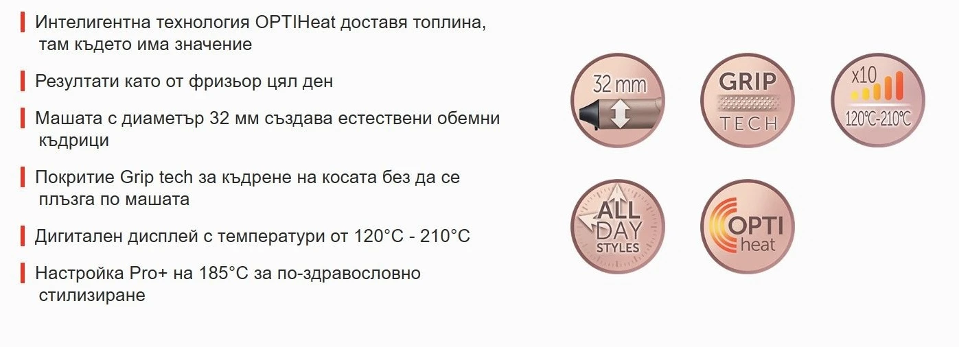 OPTIheat технология равномерно разпределя температура по цялата дължина на работния елемент, избягва горещи ядра и намалява вероятността за увреждане на косата, предизвиквано от прекомерно или неравномерно загряване. При необходимост насочва топлина към по-дебелите части на кичура, а GRIP TECH иновацията предотвратява плъзгането на кичура към дръжката по време на работа.