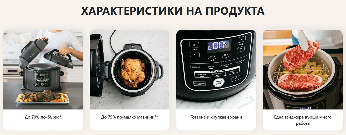 Открийте изключителната технология TenderCrisp на Ninja. Гответе под налягане, за да задържите соковете, след което приготвяйте хрупкаво за перфектен завършек. Превключете от капака под налягане към капака за хрупкавост, за да завършите храната с вкусна златиста хрупкавост.