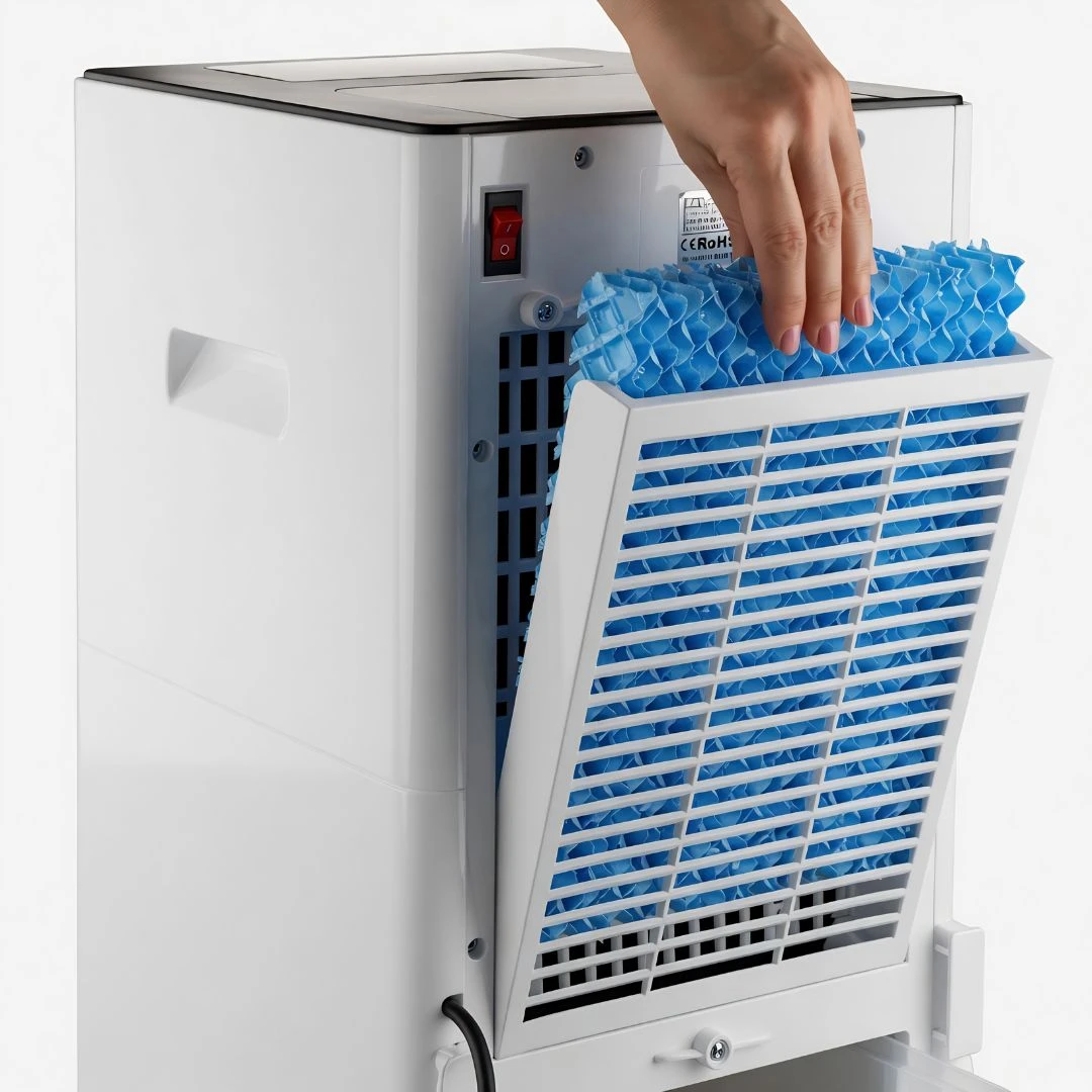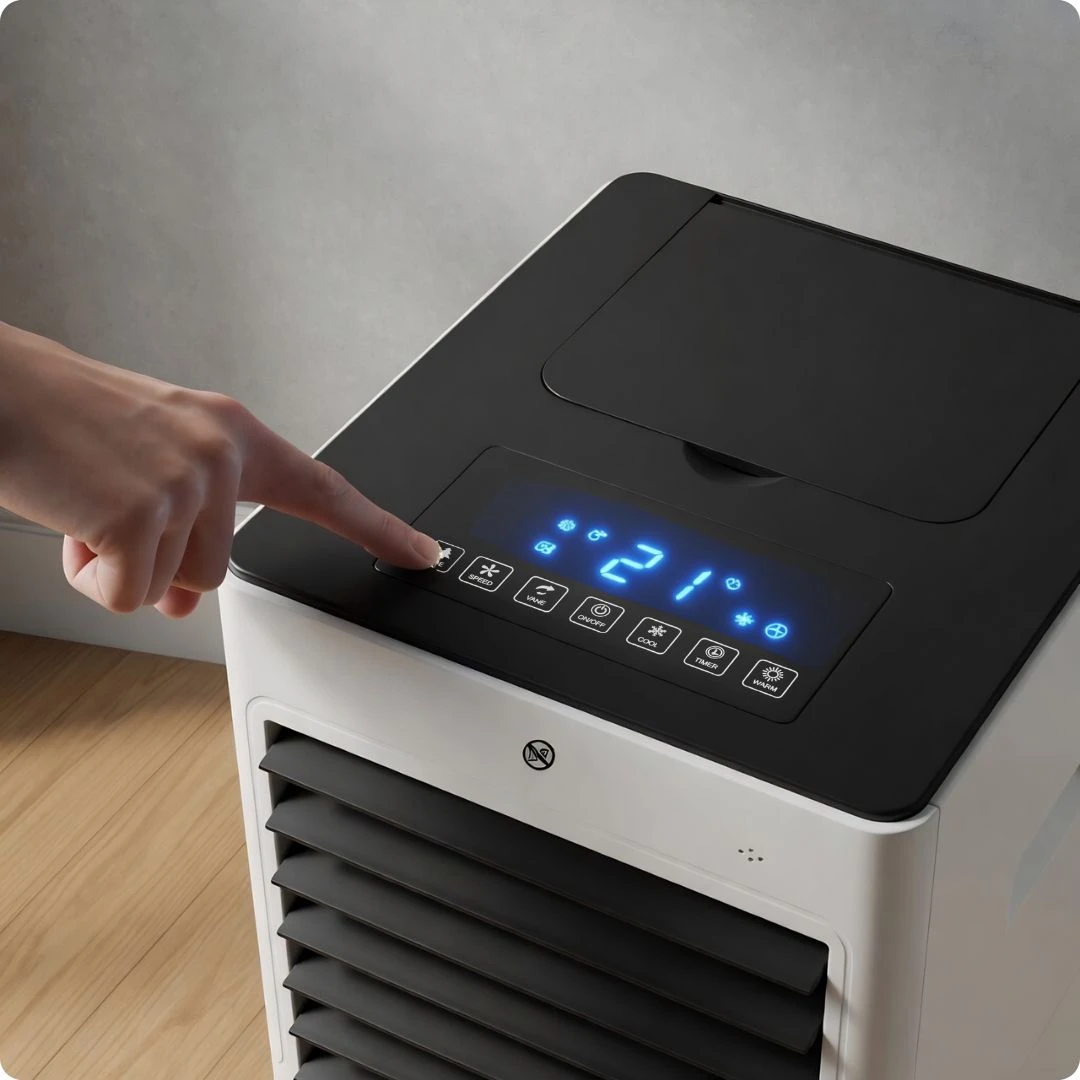 Дистанционно управление: С дистанционното управление можете удобно да контролирате всички функции на климатика от разстояние Мобилност: Устройството е оборудвано с 4 колела и удобна дръжка за лесно преместване от стая в стая Енергийна ефективност: В режим на охлаждане устройството консумира само 65W енергия, което го прави едно от най-икономичните на пазара. Лесна инсталация и поддръжка: Не изисква сложна инсталация и минимална поддръжка. Как работи функцията за охлаждане? По метода на водната филтрация. Включва хладилен агент, които се замразяват във фризера/камерата на хладилника, след което се поставя в горното отделението на уреда. В контейнера отдолу се слага вода. Охладената вода циркулира чрез система от филтри, през които се поема топъл, сух, прашен въздух, който преминава през воден филтър, след което овлажнен, пречистен и охладен навлиза в помещението. За по-бързо и ефективно охлаждане, може да се използва и лед.