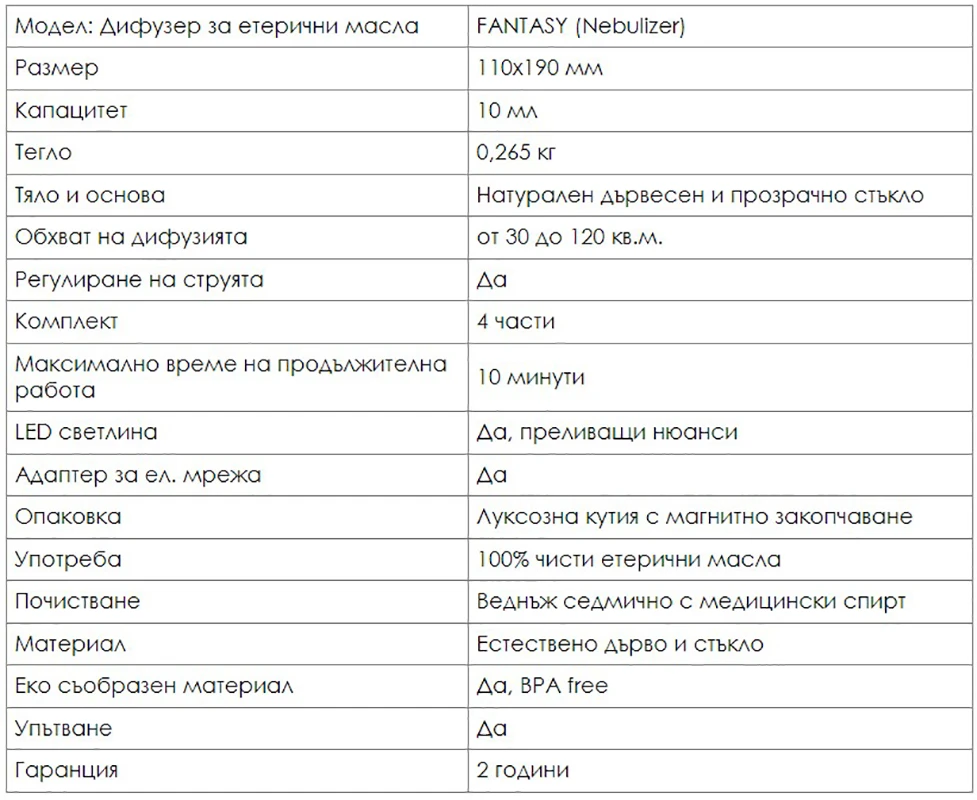 Дифузер за ароматерапия с етерични масла без добавяне на вода. Изработен е от естествено дърво и висококачествено стъкло. Вместимостта на стъклената гилза е 10мл. Препоръчва се за площ от 30 до 120 кв.м. в зависимост от силата на регулиране. Автентичният дифузер (Nebulizer) FANTASY e създаден за дифузия на етерични масла без добавяне на вода. Състои се от основа от естествено дърво, висок клас стъклена гилза с капацитет 10 мл, стъклена дюза за пулверизиране, ключ за регулиране интензитета на струята и адаптер за включване в електрическата мрежа. Обхватът на дифузията покрива до 120 кв.м. в зависимост от силата на регулиране.