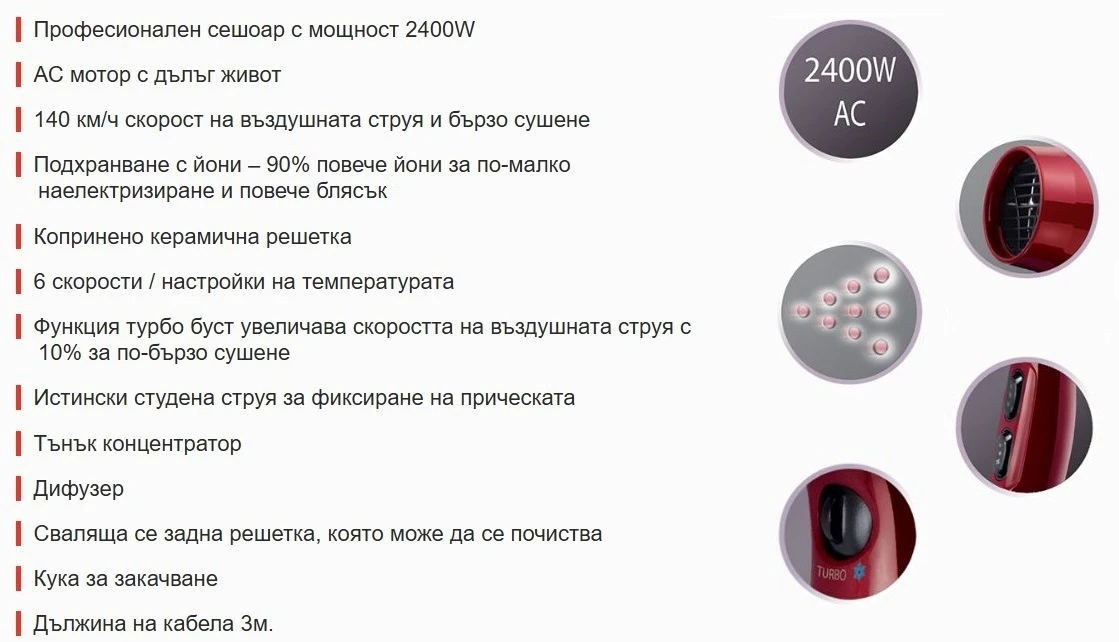С 6 скорости / настройки на температурата и турбо буст функция за допълнителни 10% увеличение на скоростта на въздушния поток и бутон за студена струя, вие можете да постигнете оптимално изсушаване на косата.