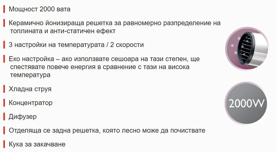 Този сешоар не само ще ви помогне да постигнете великолепен външен вид, но той също така е и екологичен уред! С просто превключване на „Еко” режим уредът спестява значително повече енергия от другите настройки на топлината. Умно, нали!