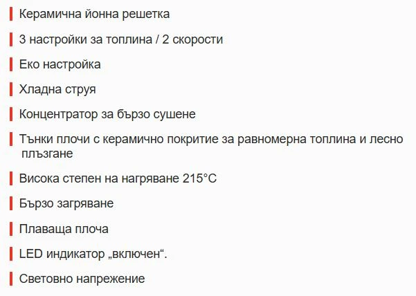 Естествено, плочите на пресата са с керамично покритие за равномерно разпределение на топлината без горещи ядра, които биха увредили косата. Подвижната горна плоча прилепва плътно към кичура за по-малко повторения и по-лесна работа с по-малко увреждане. Работната температура на пресата е 215°C - напълно достатъчни да се справят и с най-упоритите коси. Тази температура се постига бързо - само за 30 секунди. Пресата е подходяща и за къдрене, макар и да не е специално предназначена за това. Кабелът за тази преса е с подвижна връзка и никога няма да се усуква и да пречи на работата Ви. Уредът може да се ползва и в чужбина, при електрически мрежи с напрежение от 100 до 240 волта.