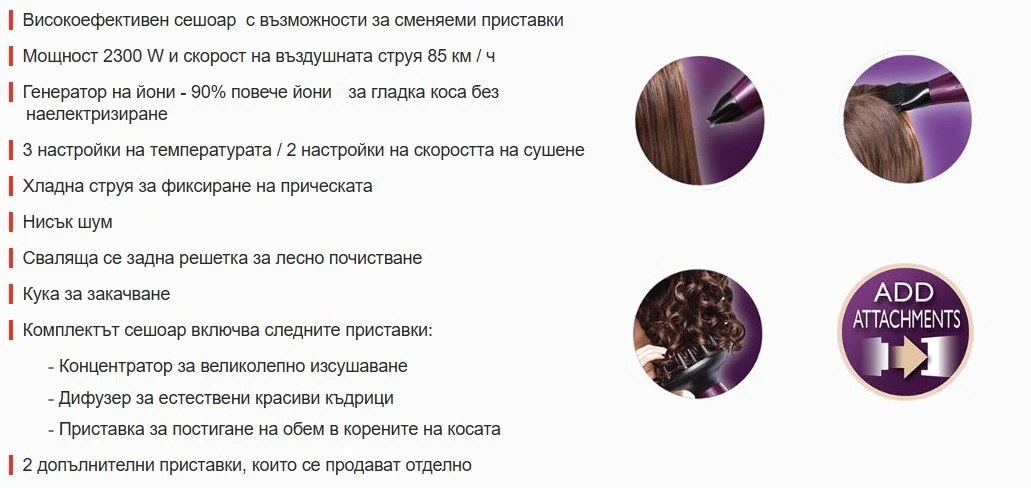 Този мултифункционален уред за оформяне на коса не само идва с три сменяеми приставки, но също така и с възможност за закупуване на още две отделни приставки, включително приставка Spin Curl за направа на свободни, отпуснати вълни и тънък широк концентратор за постигане на супер прави, красиви прически за броени минути.