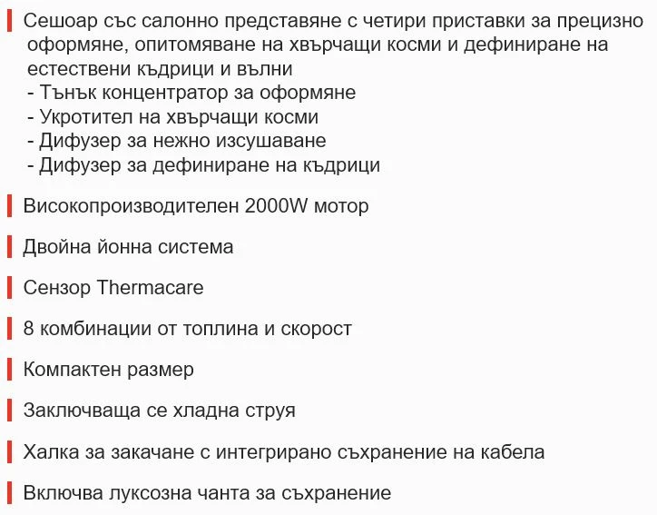 Защо да отделяте повече време, отколкото ви е необходимо, за да изсушите косата си? Мотор от 2000 W, който е достоен за салон, генерира скорост на въздуха до 120 км/ч за 25% по-бързо сушене.