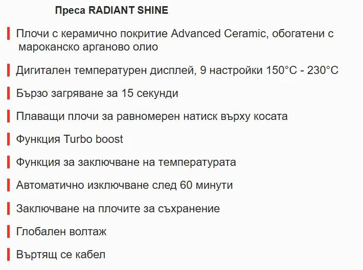 Цифров контрол на температурата с 9 настройки на топлина, вариращи от 150-230°C, означава, че всички типове коса са обгрижени. Използвайте по-висока температура за оформяне или изправяне на плътна или къдрава коса и настройка на по-ниска температура за оформяне на фини типове коса.