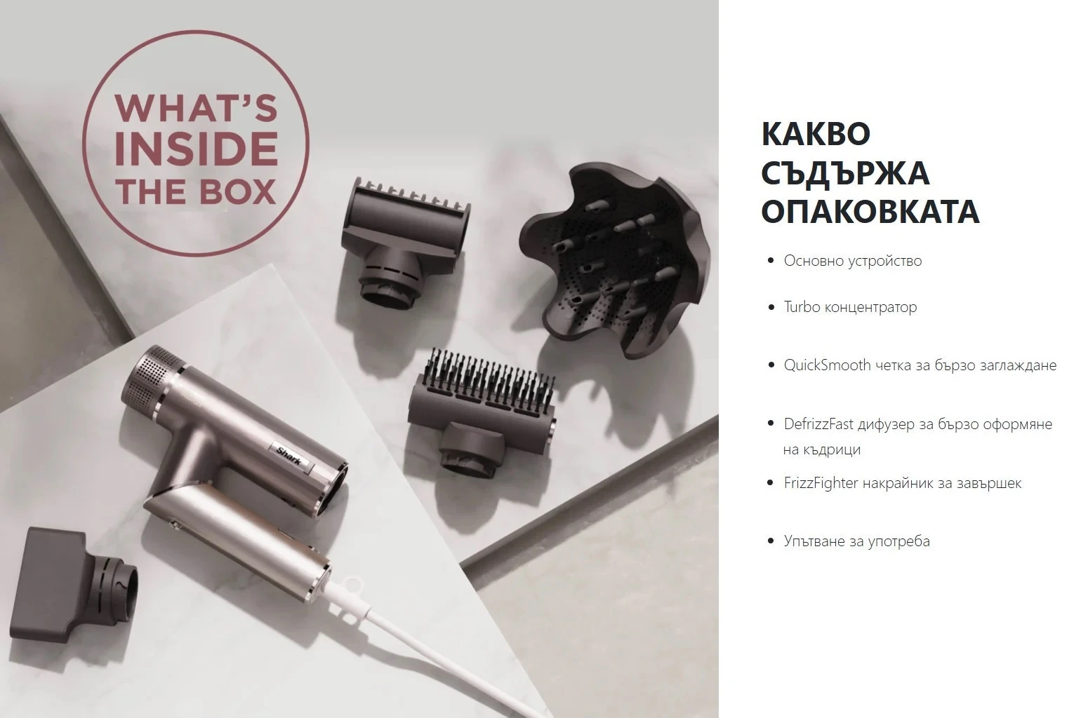 | Приставки | Turbo Концентратор Quicksmooth Четка Defrizzfast Дифузер Frizzfighter Накрайник |