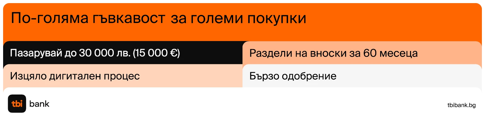 Не пропускай да добавиш застраховка „Защита на покупката и стоката“. Важно е. В случай на пълна повреда, кражба, грабеж или други неблагоприятни събития, съобразно посочените условия на нашия застраховател, той може да покрие частично или изцяло стойността на стоката. Научи повече за защитата, като се свържеш със служител на tbi на 0700 17 571 / *8242 или прочети ТУК.