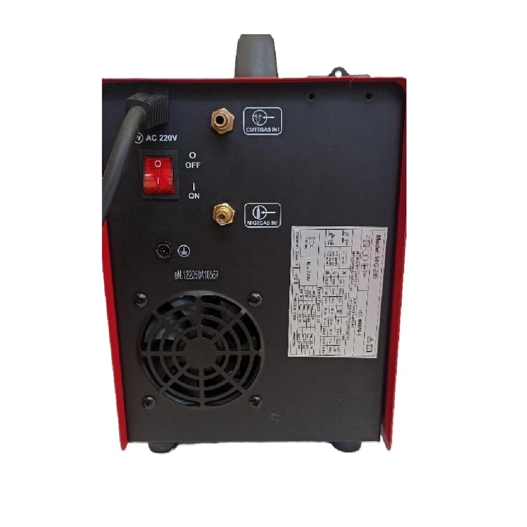 Машината работи с ролка от 5 кг Захранващо напрежение: 110V/220V/50Hz - монофазен ток Степен на защита: IP21S MMA Заварява с електроди от 1,5 до 5 мм Тегло на целия комлект 18 кг Тегло на апарата: 12 кг Размери:Дължина /Ширина /Височина (455 мм /200 мм /300 мм) Номинален работен цикъл: 60% Сертифициране: CE Диапазон на изходящия ток (A) :MIG 20-285 / ММА 20-285 Ефективност(%) : 85 Коефициент на мощност (COS) :0,73 Клас на изолация:F Работен цикъл на при 100 % натоварване MIG - 221A/25.1V ММА - 221A/ 28.8V CUT - 31A/92.4V LIFT TIG - 221A18.8A Работен цикъл на при 60 % натоварване MIG - 285A/28.3V ММА 285A/ 31.4V CUT - 40A/96V LIFT TIG - 285A/21.4V